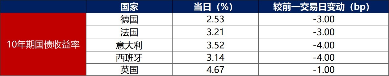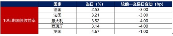 5月27日,主要欧洲经济体10年期国债收益率普遍下行。其中,德国10年期国债收益率下行13bp至2.53%,法国、意大利、西班牙、英国10年期国债收益率分别下行3bp、4bp、4bp和1bp。